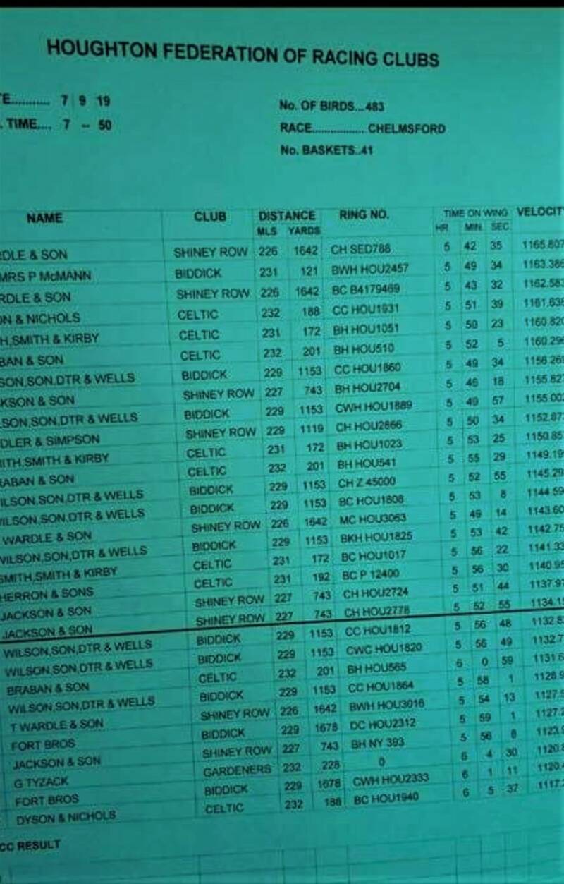 Op de vlucht uit CHELMSFORD 226 miles 1642 yards = 365.2132 km behaalde WARDLE & SON de 2e in de club, 3e in de federatie van 483 duiven met een onzer duiven 4179469/19 , toch mooi al die prestaties over het kanaal. De foto's zijn screenprints, dus van geen te beste kwaliteit maar bewijzen wel hun echtheid.