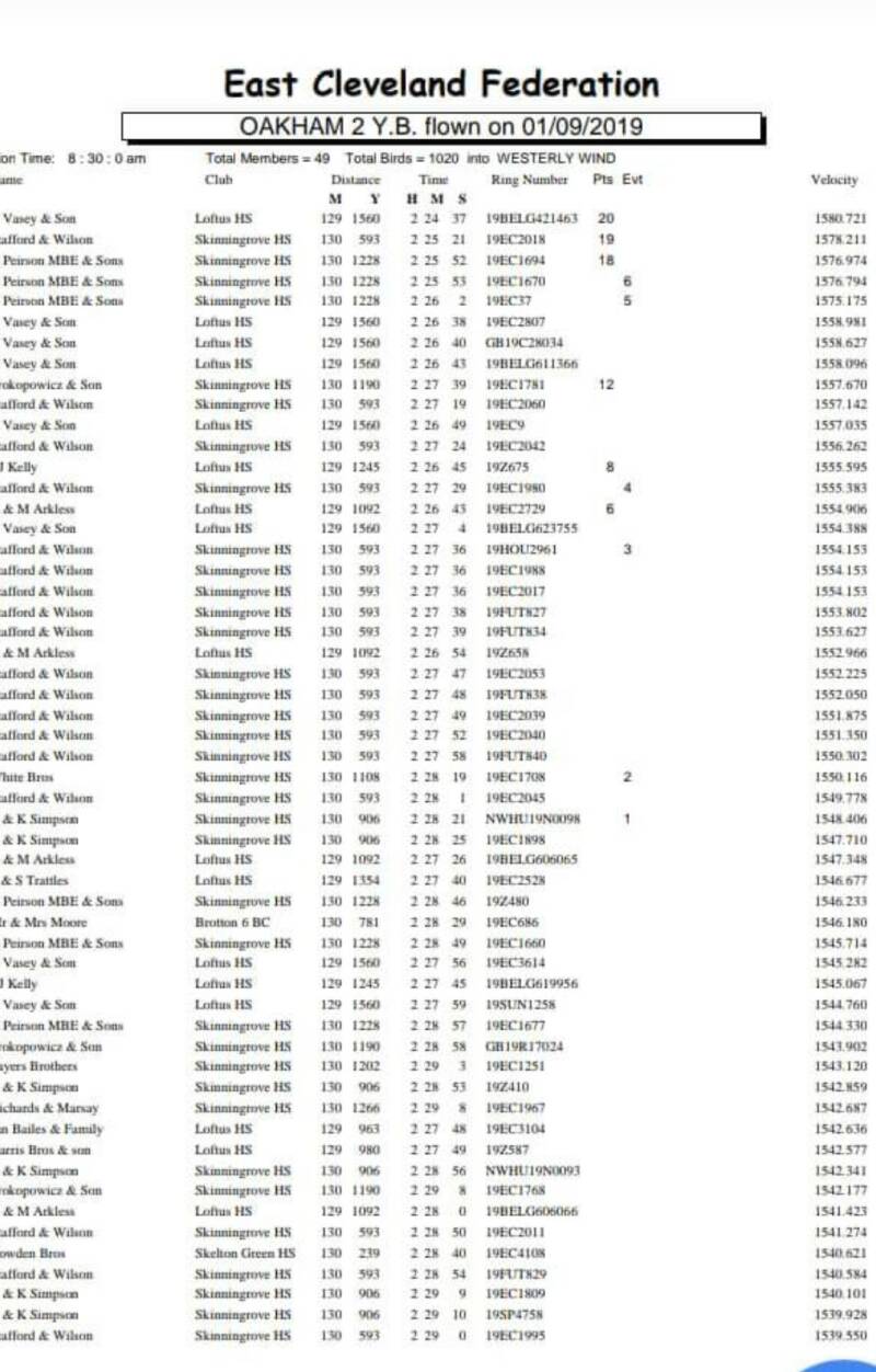 In September 2019 behaalden Vasey & Son met een jonge duif van ons hok 1e club tegen 358 d, 1e federatie van 1020 d en de 1e section tegen 3256 d. op de vlucht uit OAKHAM 129 miles 1560 Yards = 209.031 km